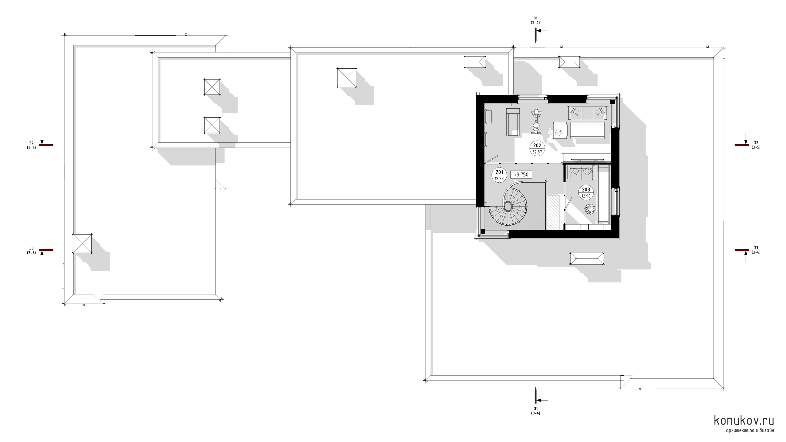 201 Холл 12.3м² 202 Игроваая 32.4м² 203 Кабинет 12.9м²