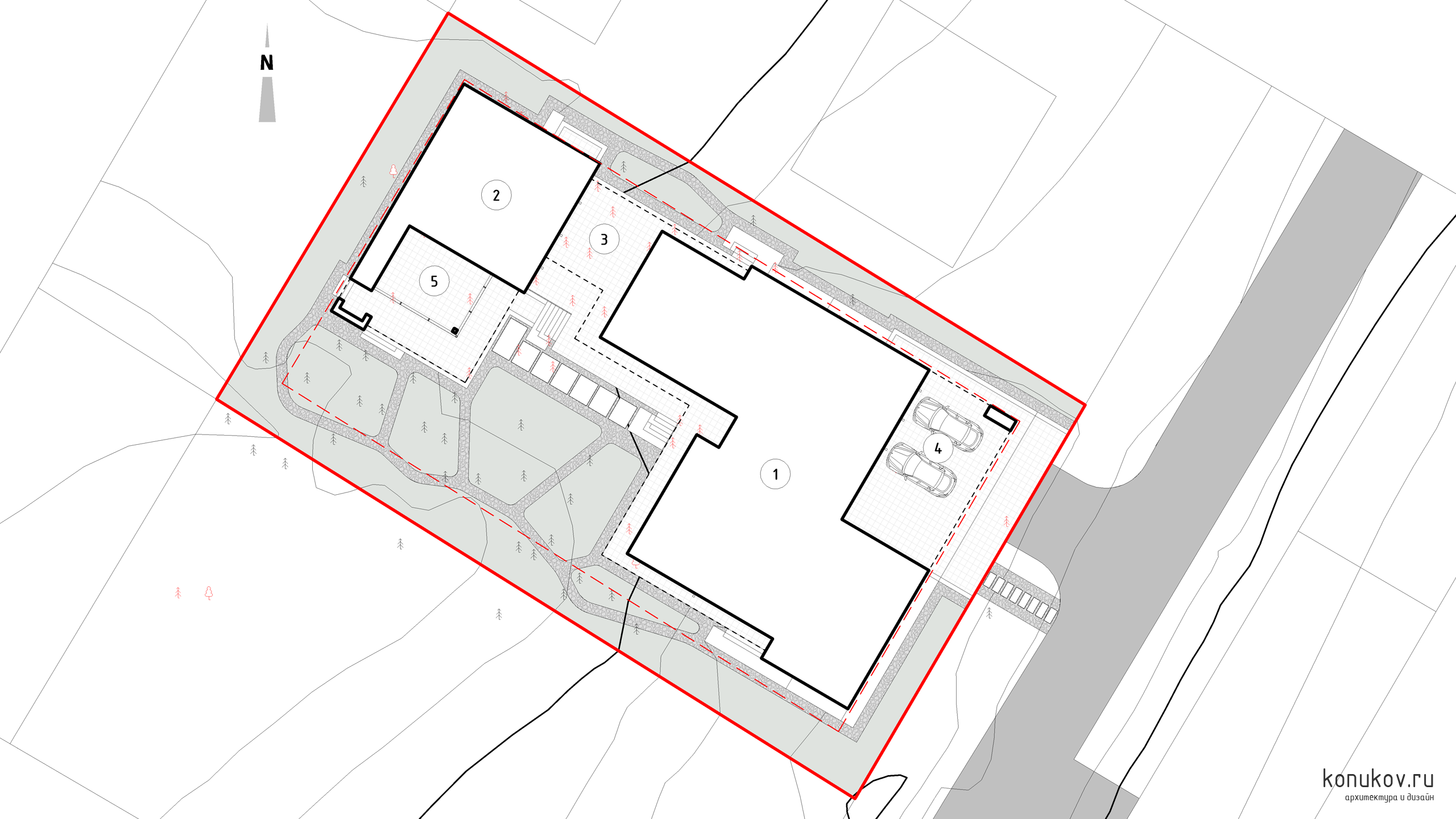 1 Дом. 2 Баня. 3 Открытая терраса. 4 Навес на два машиноместа. 5 Терраса закрытая